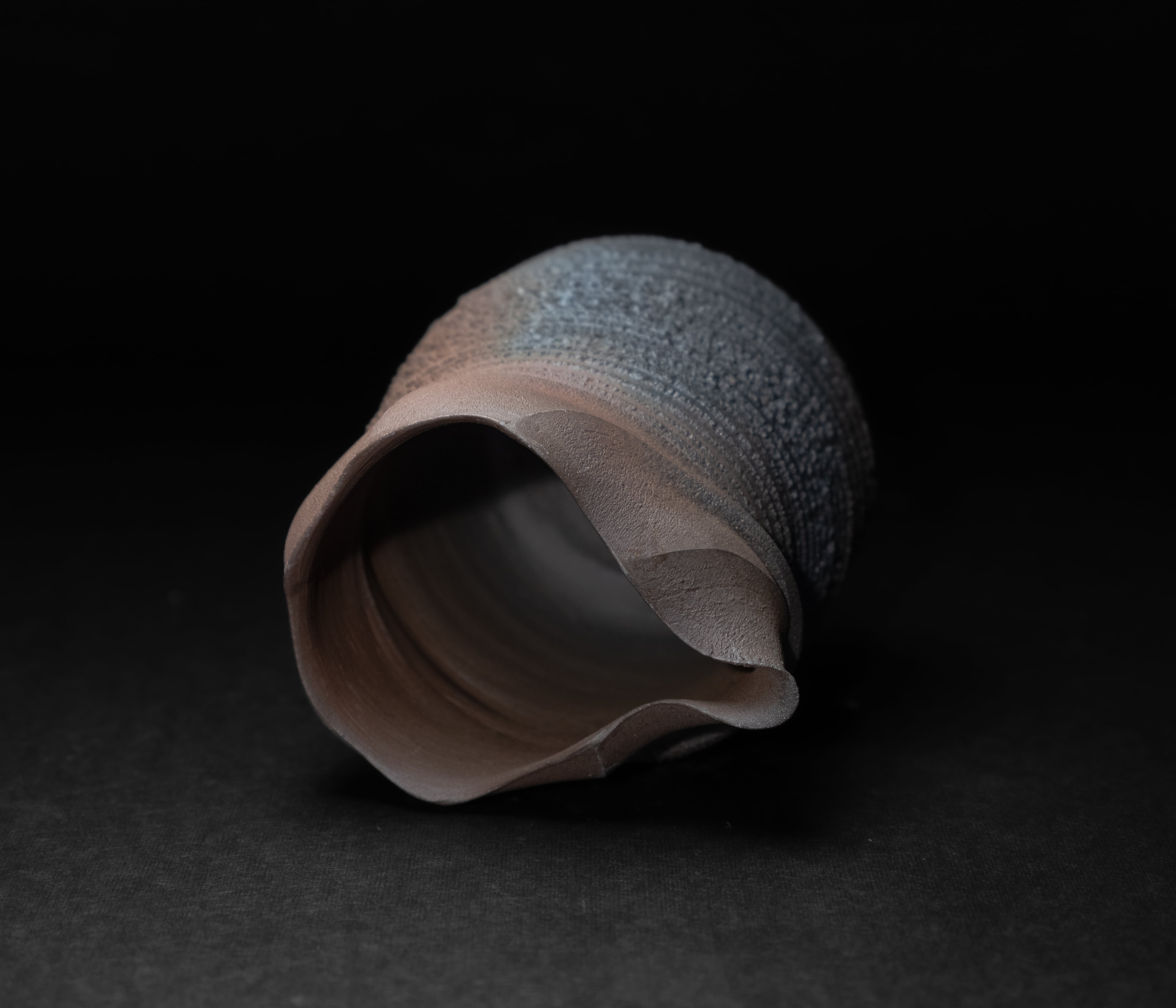 ロクロの遠心力を操り、ねじれや亀裂模様を作品の表面に浮かび上がらせる手法です。