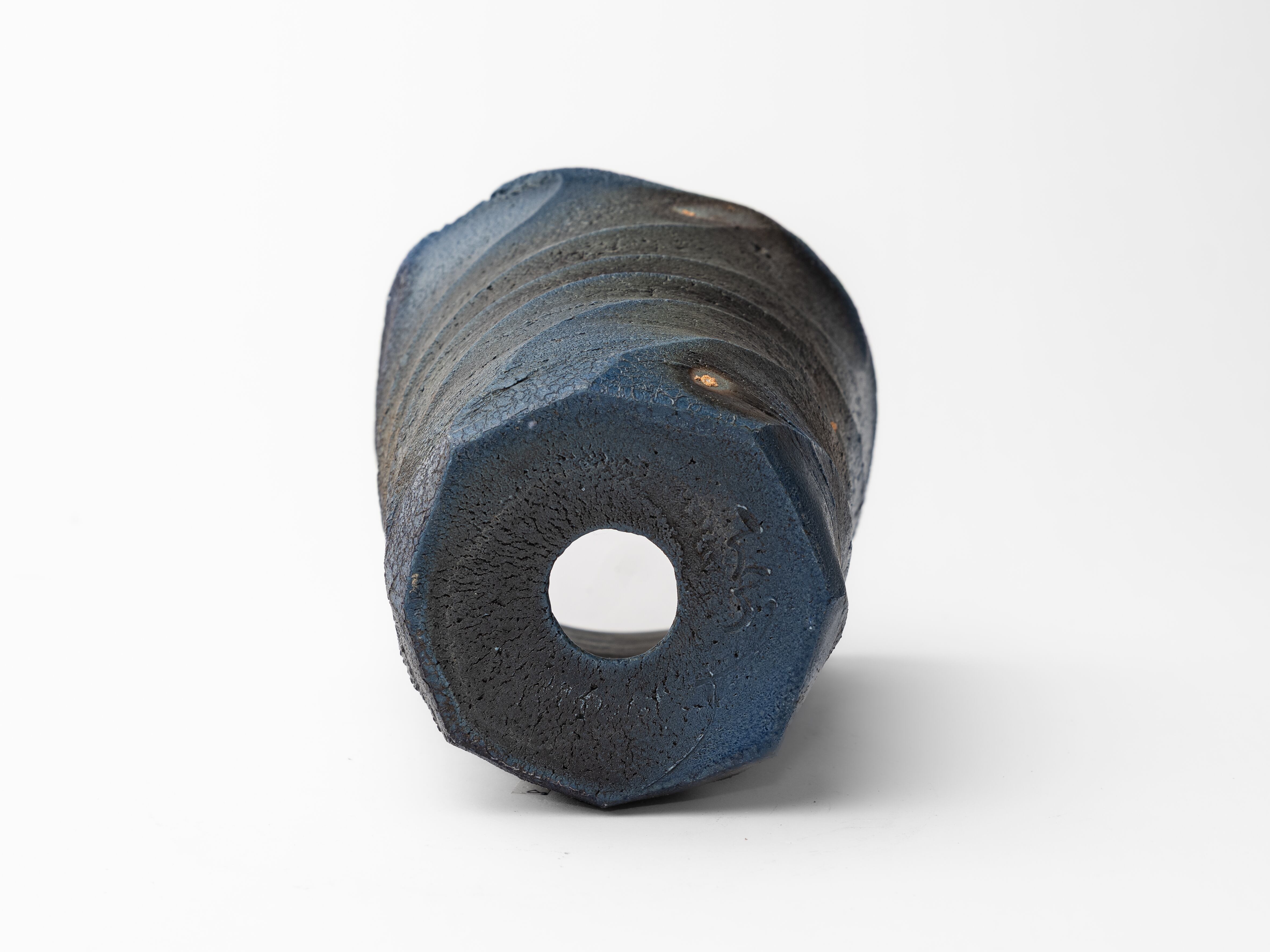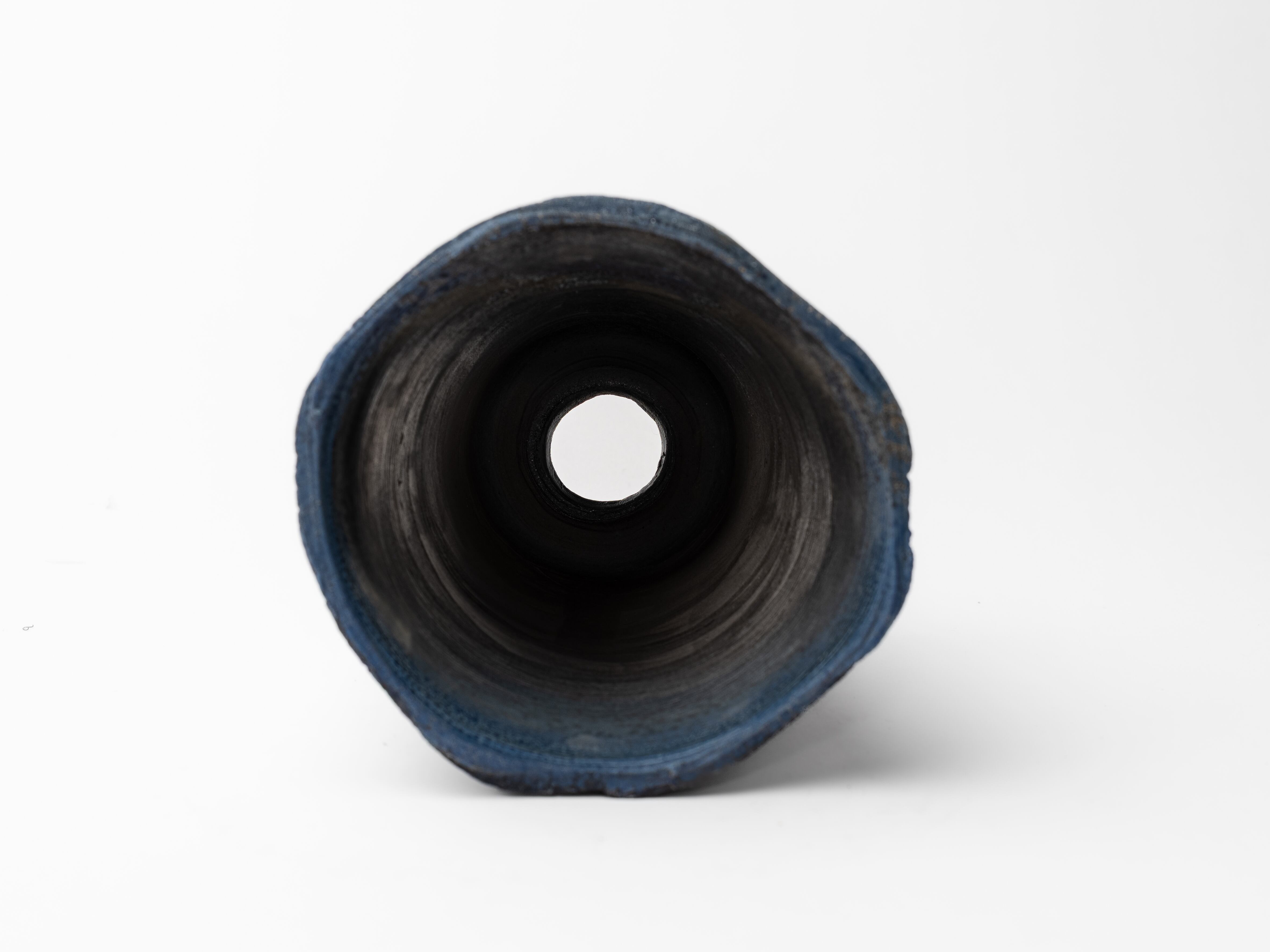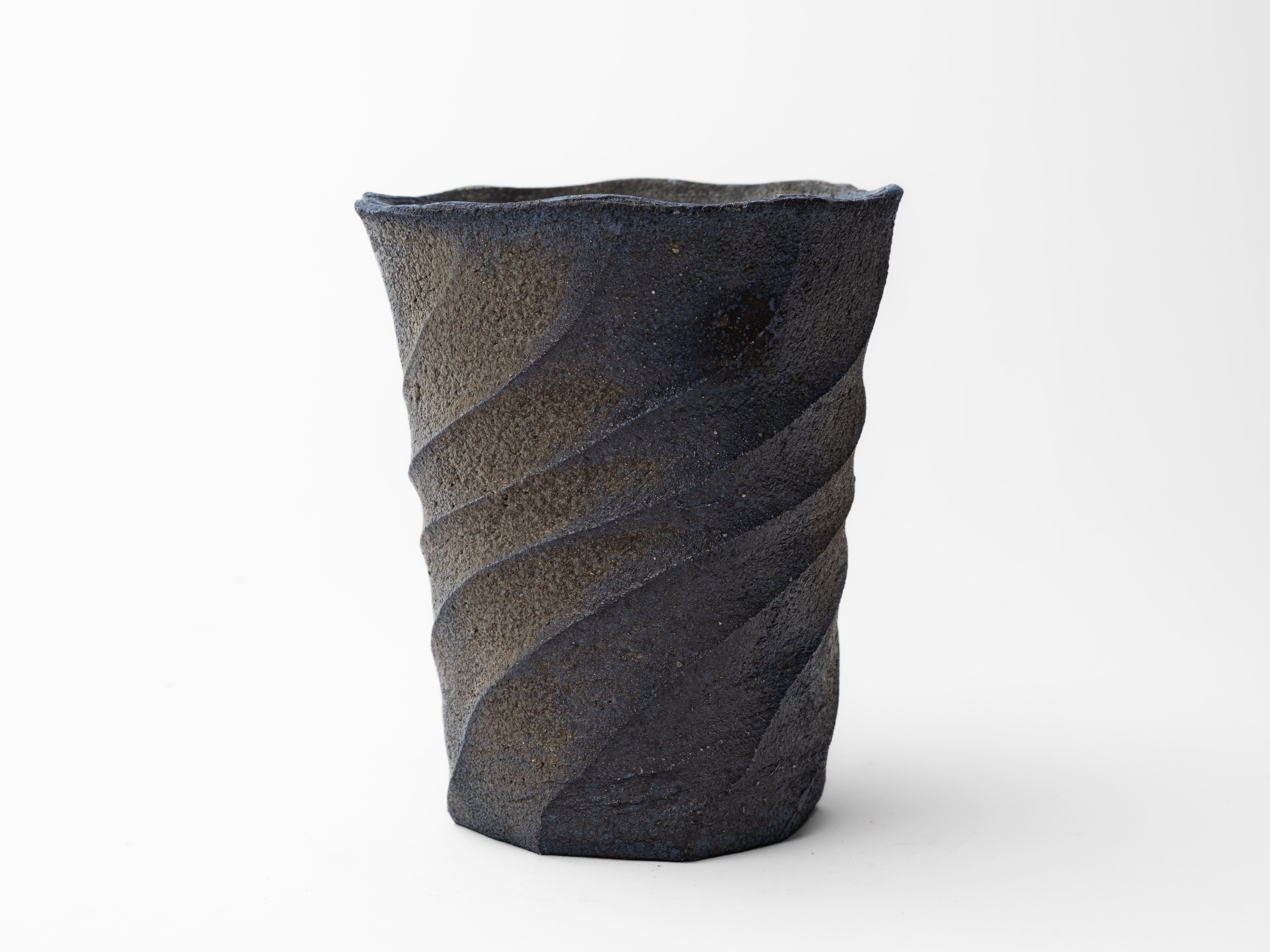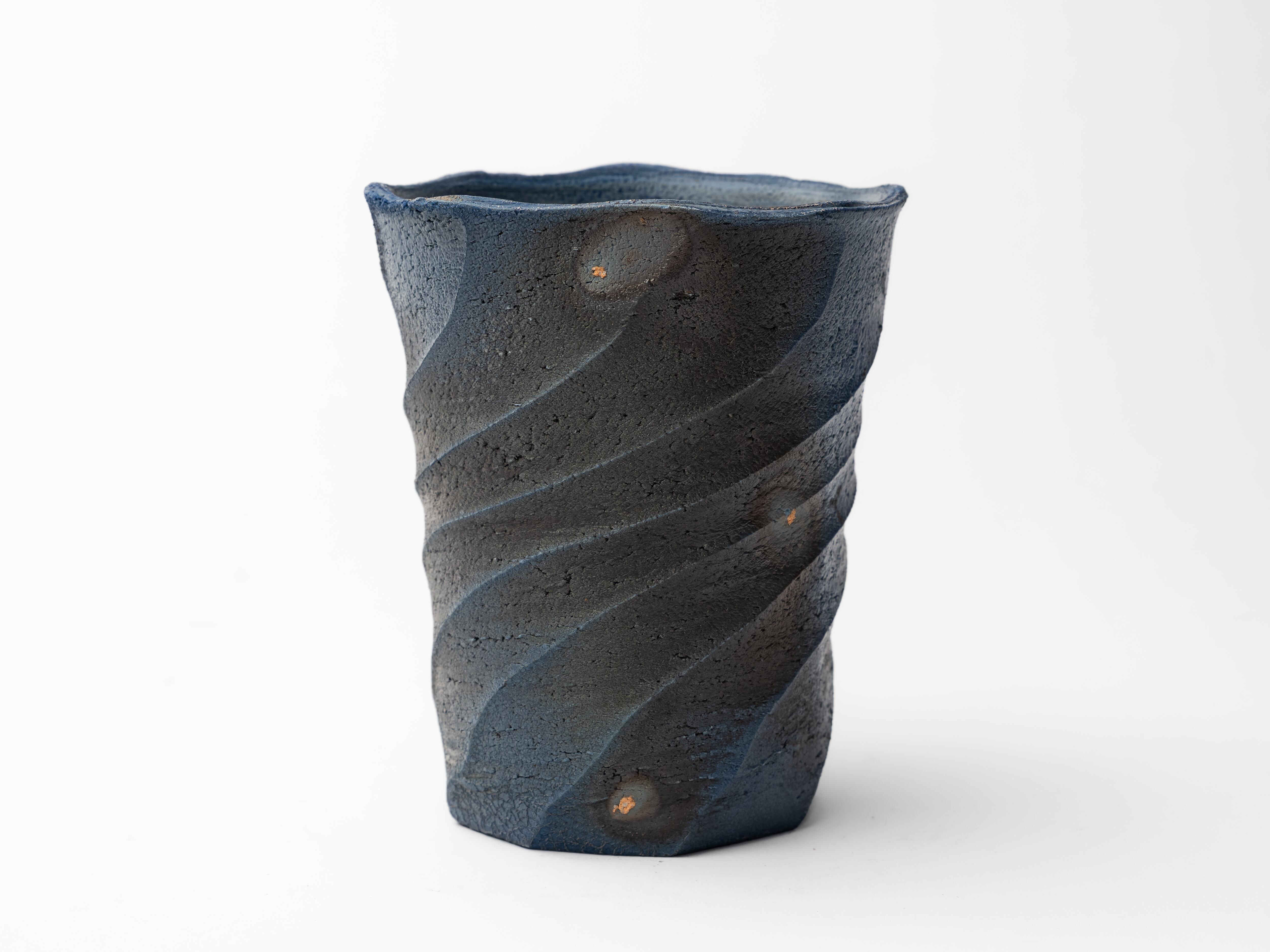 深く、マットな質感の青色は、冷たさを感じさせない温かみのある蒼。 その表面には、ゆったりと大きくうねる、おおらかな螺旋が刻まれており、まるで夜空を流れる雲や風のような動きを感じさせます。