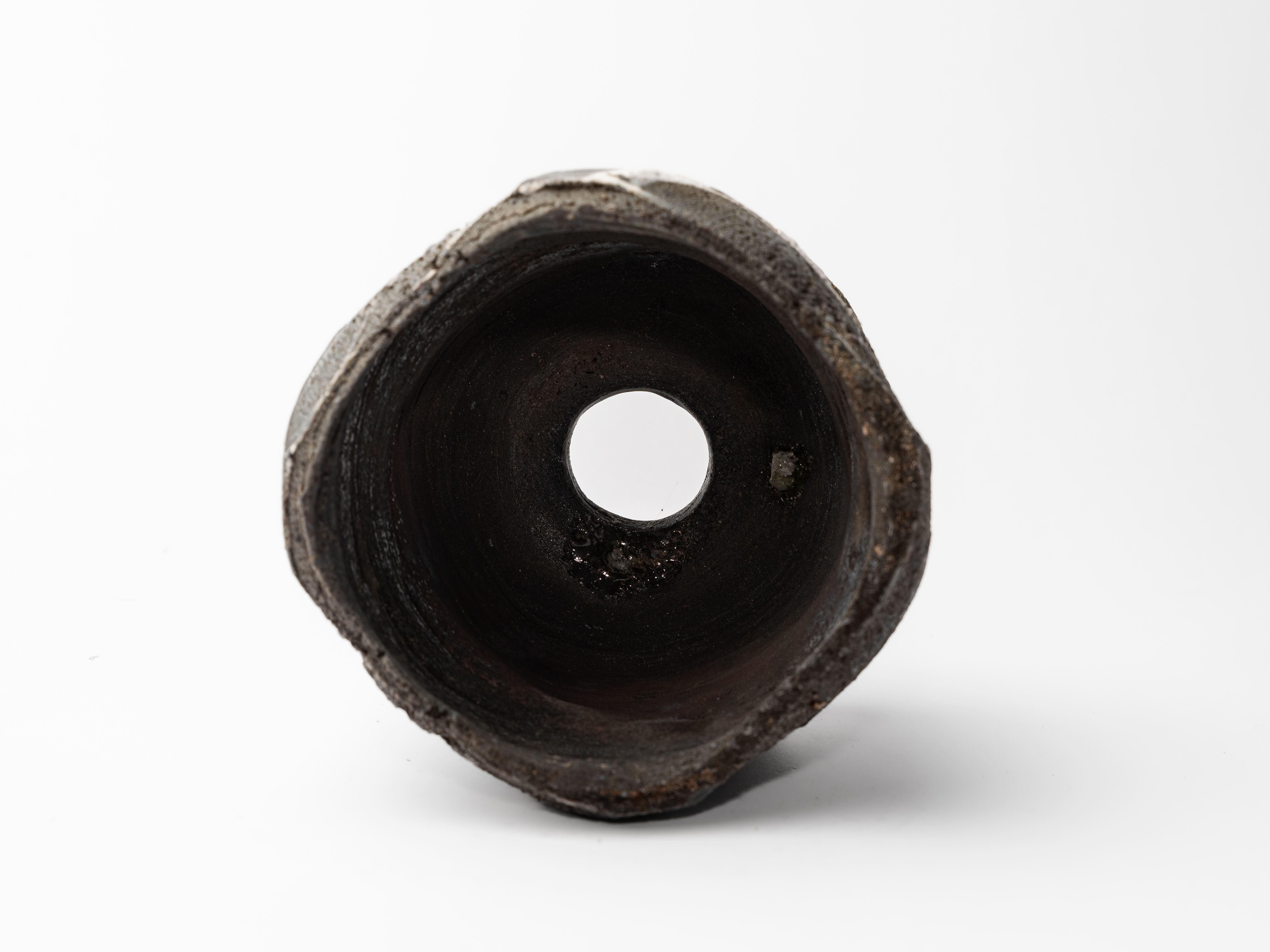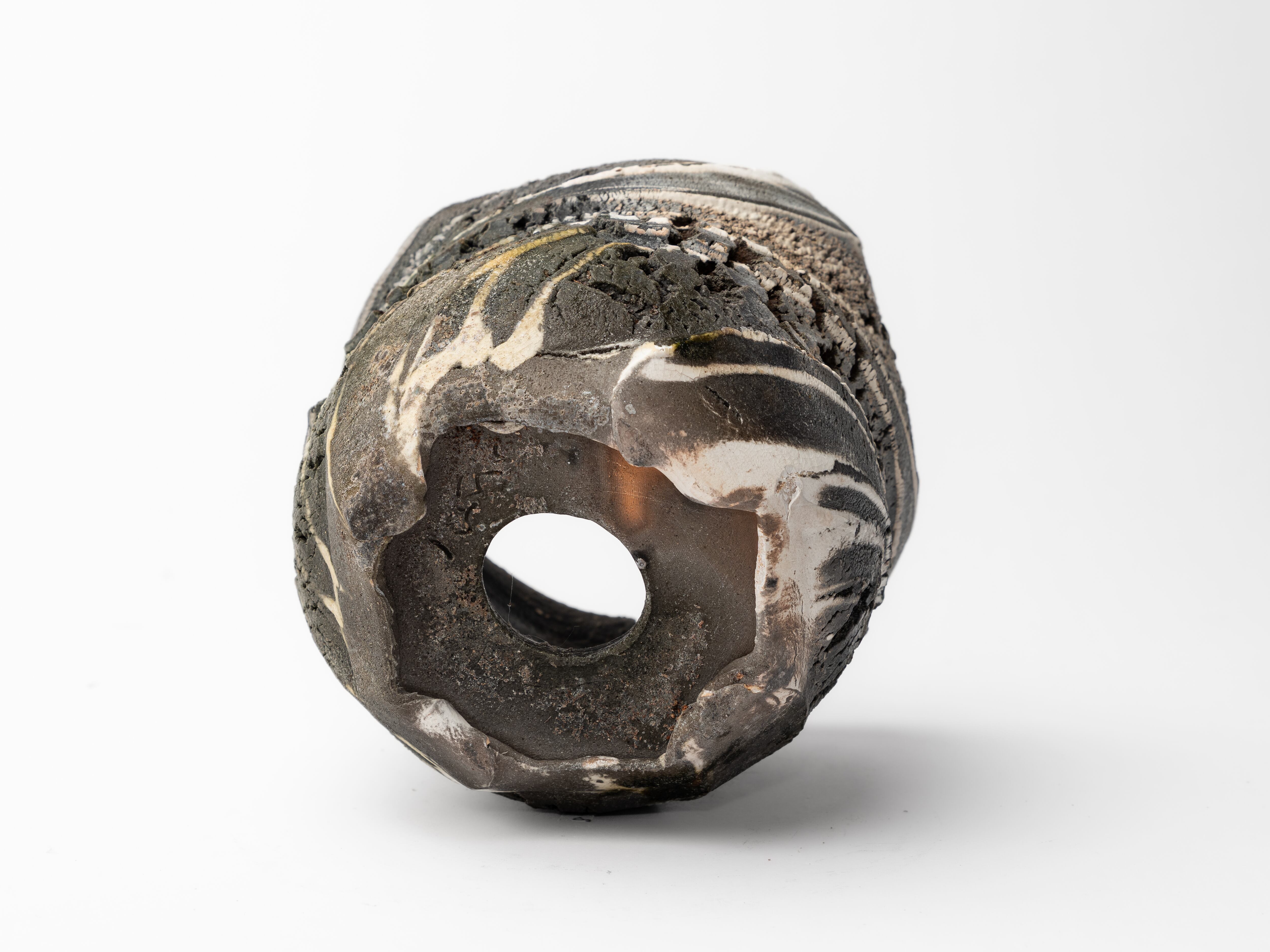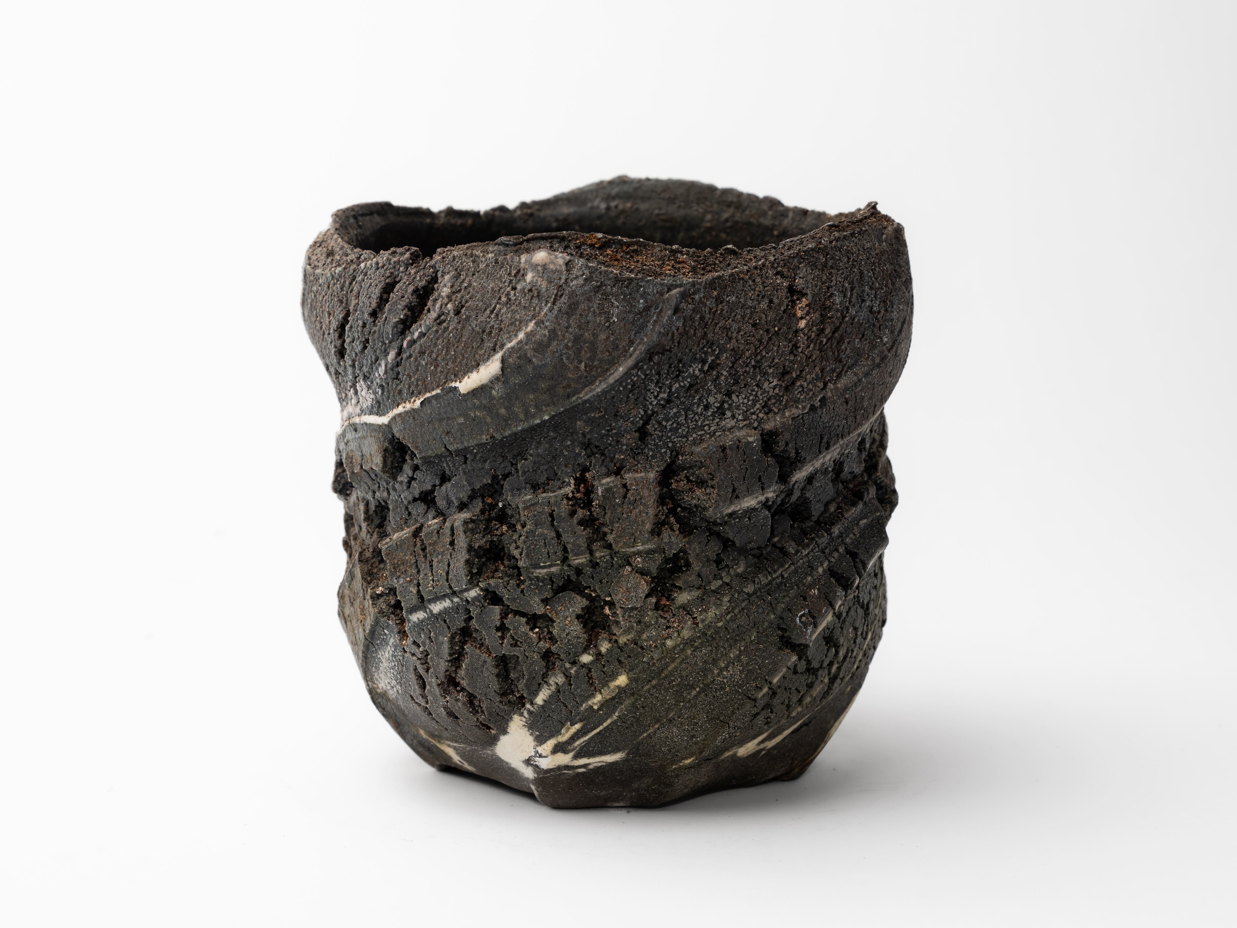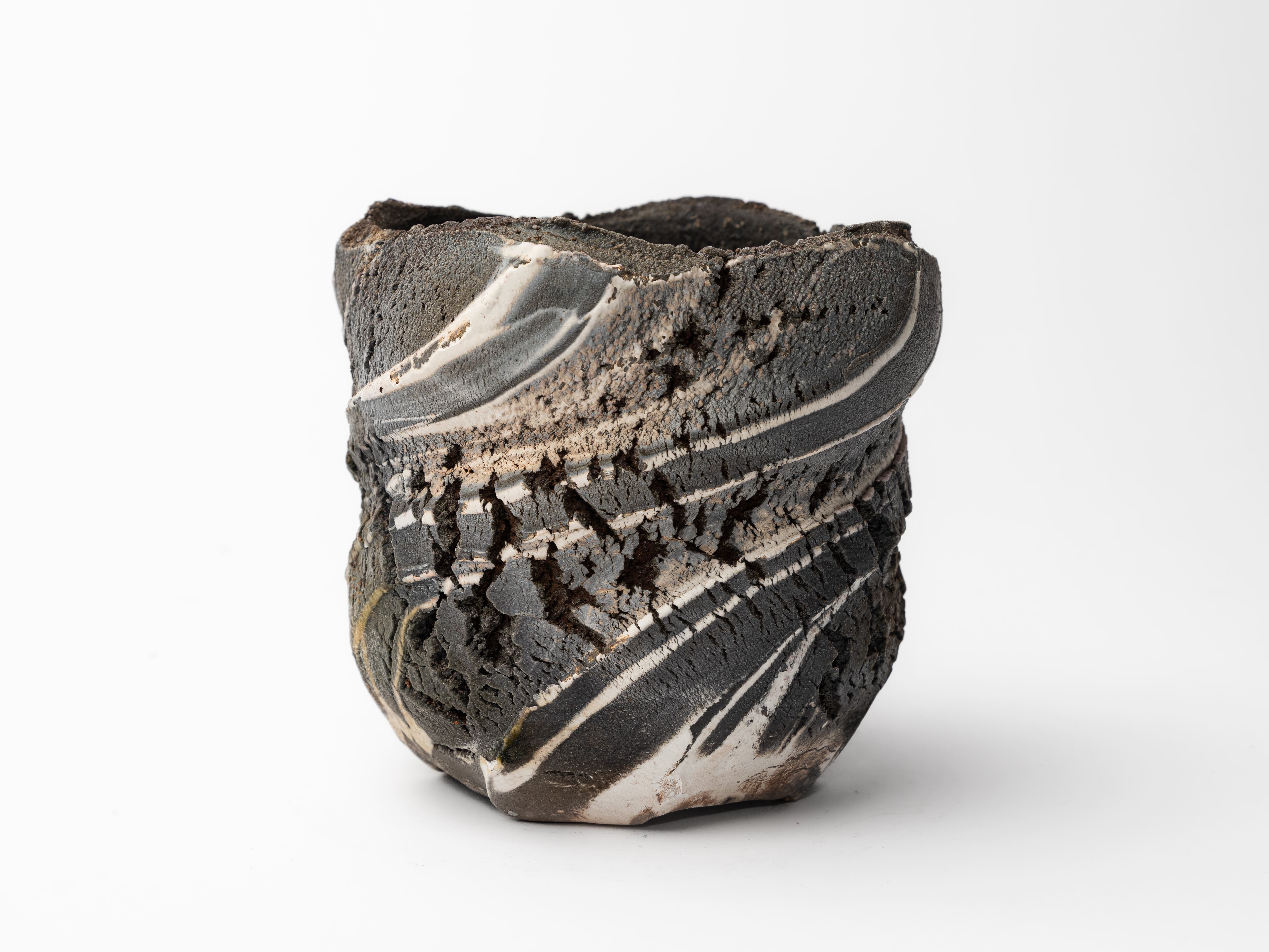 薪窯焼成によって生まれた鈍いグレーの地肌。そこへ大胆に施された「白い泥」が、まるで暗雲を切り裂く稲妻のように走っています。