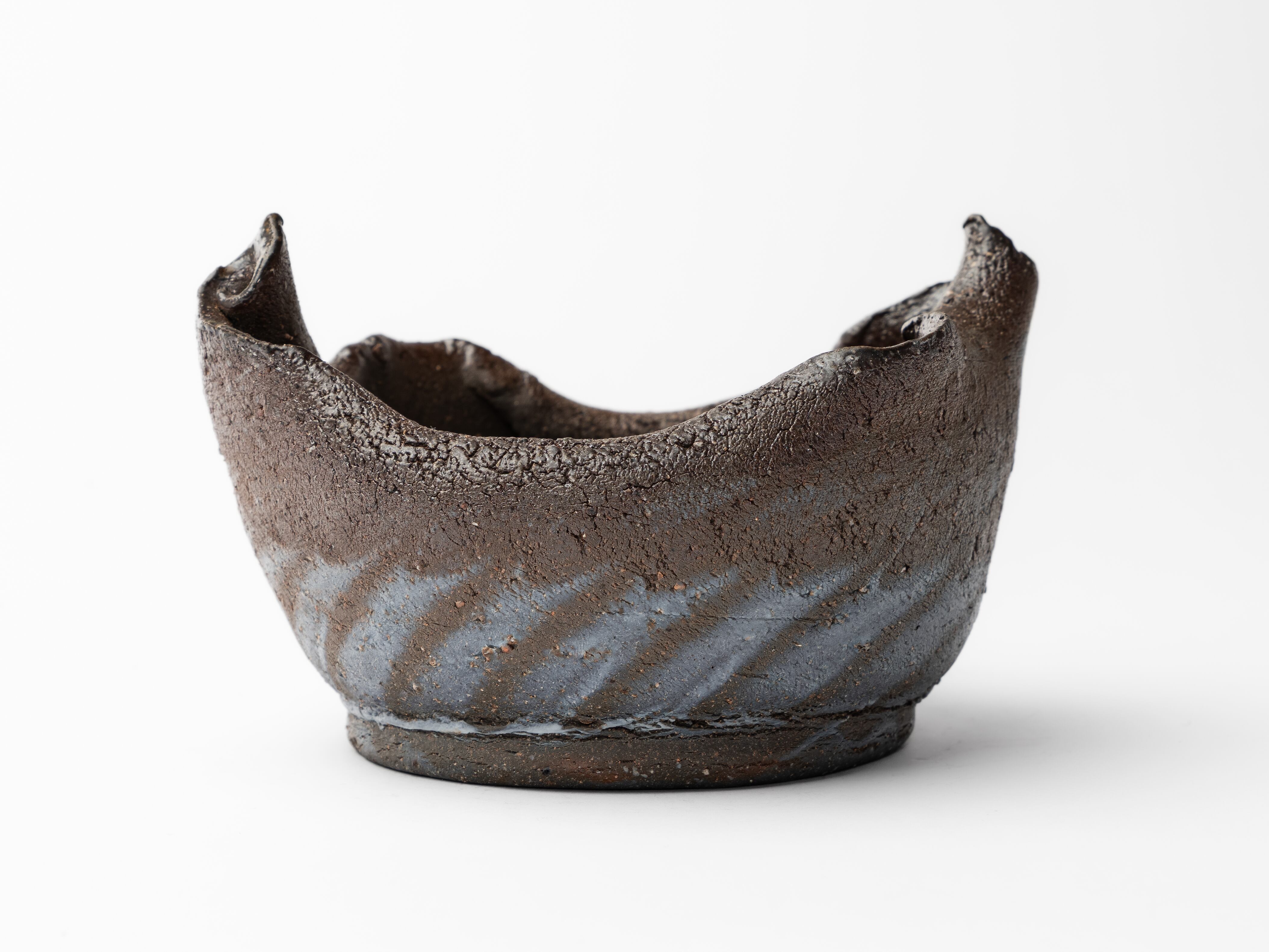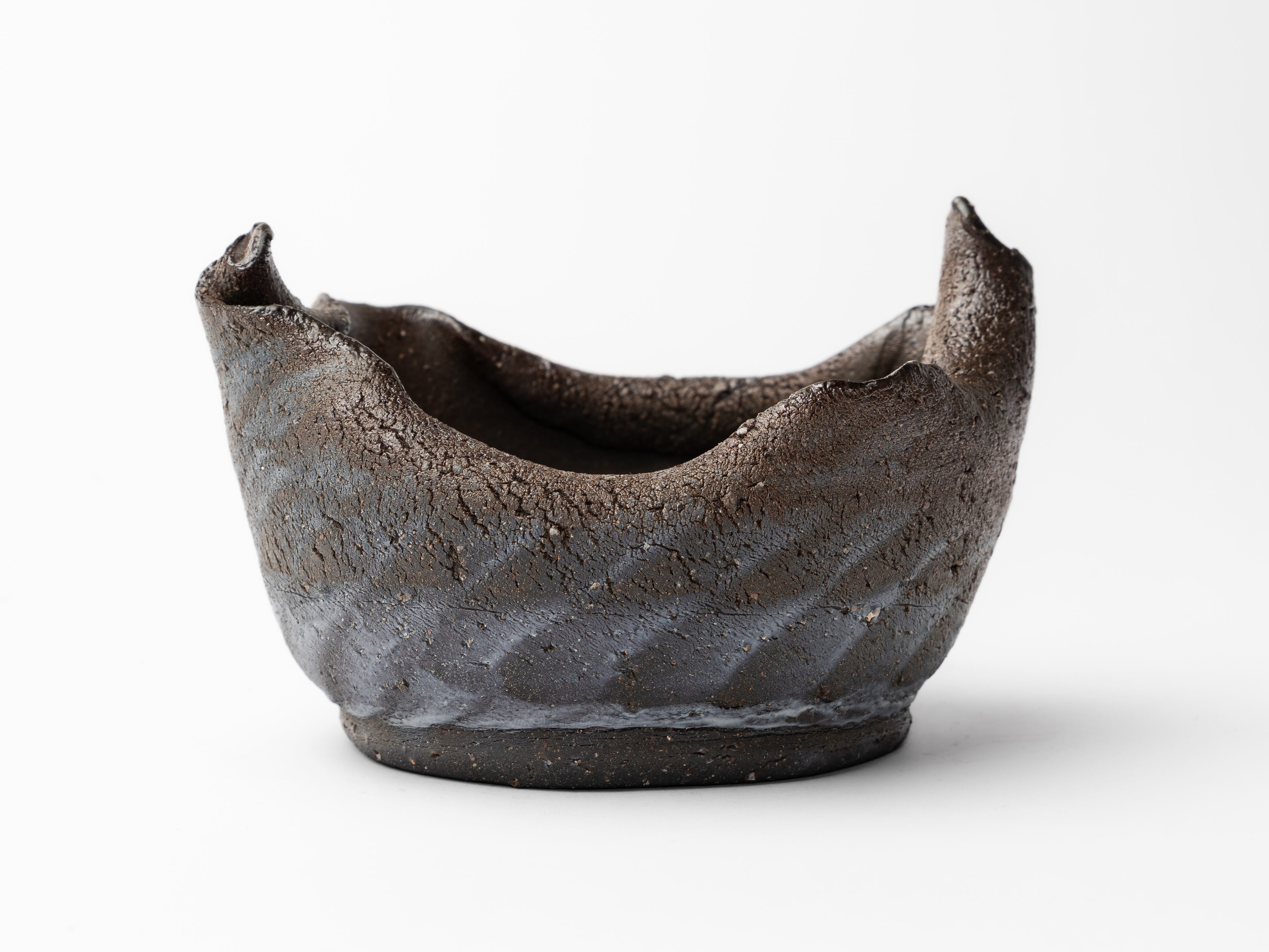 深く落ち着いた土色の肌に、刷毛で掃いたように施された「青みがかった泥」。 その静かなコントラストは、まるで夕暮れの湖畔や、夜明けの稜線のような景色を連想させます。