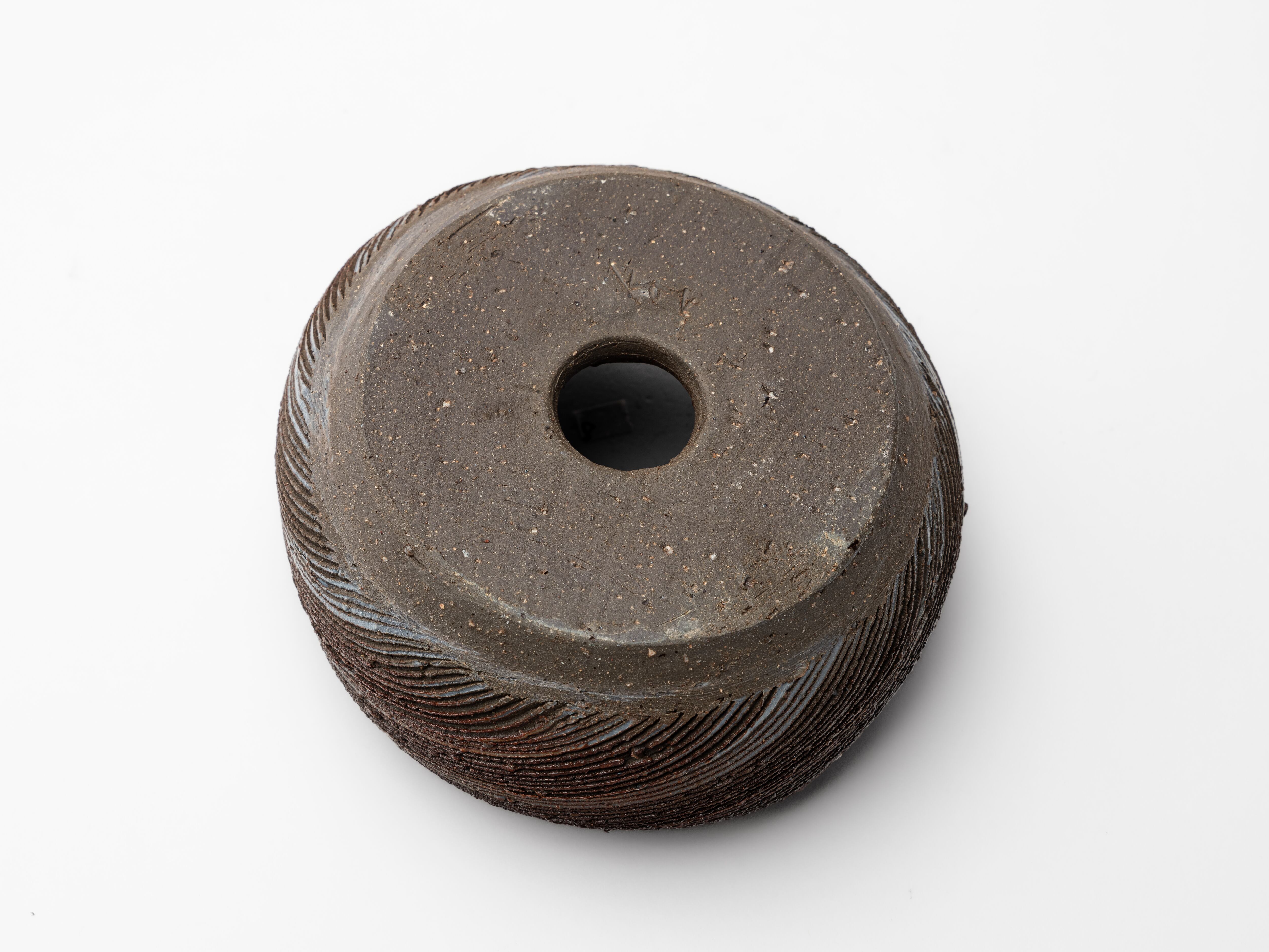 深く落ち着いた土色の肌に、刷毛で掃いたように施された「青みがかった泥」。 その静かなコントラストは、まるで夕暮れの湖畔や、夜明けの稜線のような景色を連想させます。