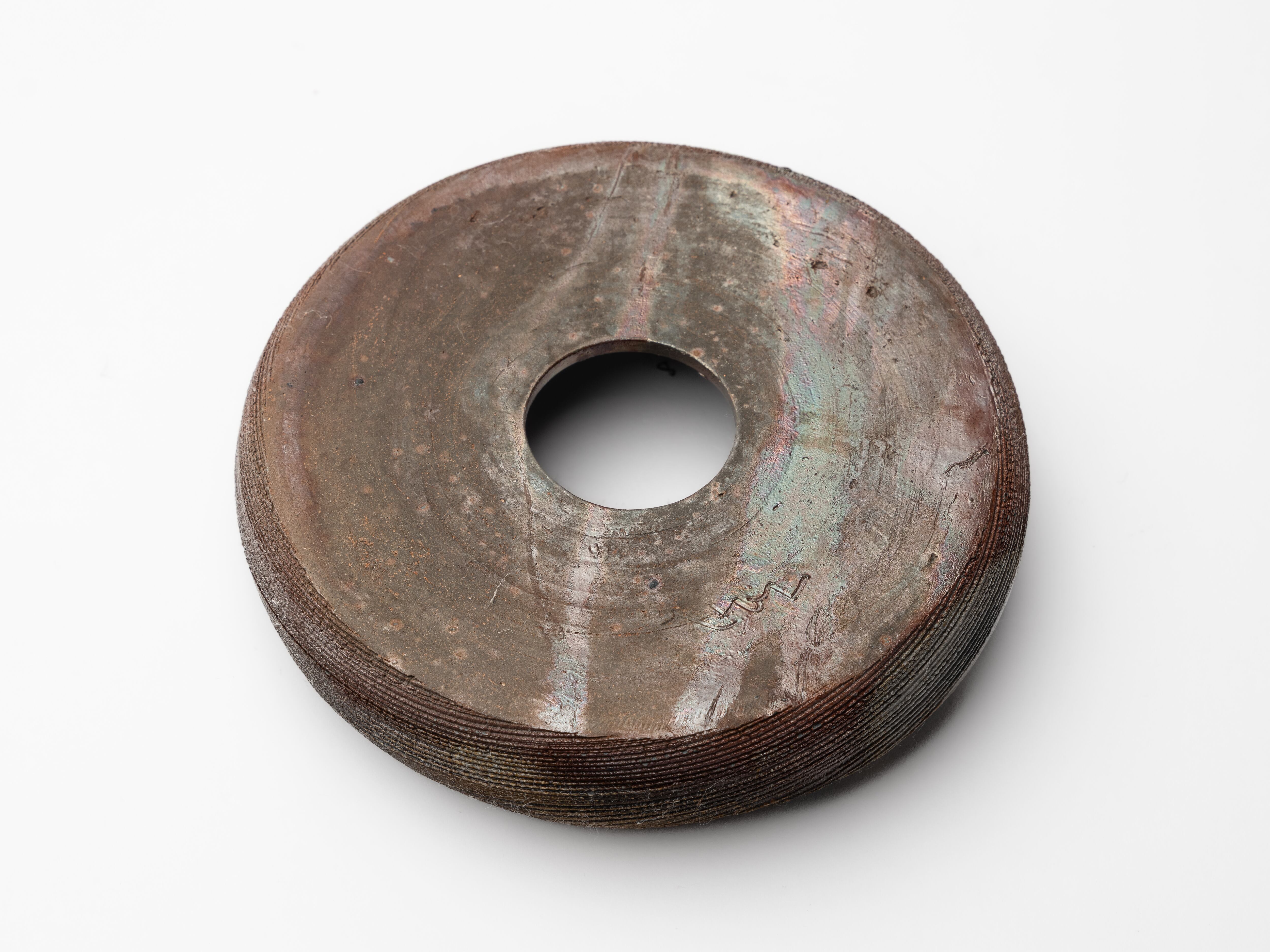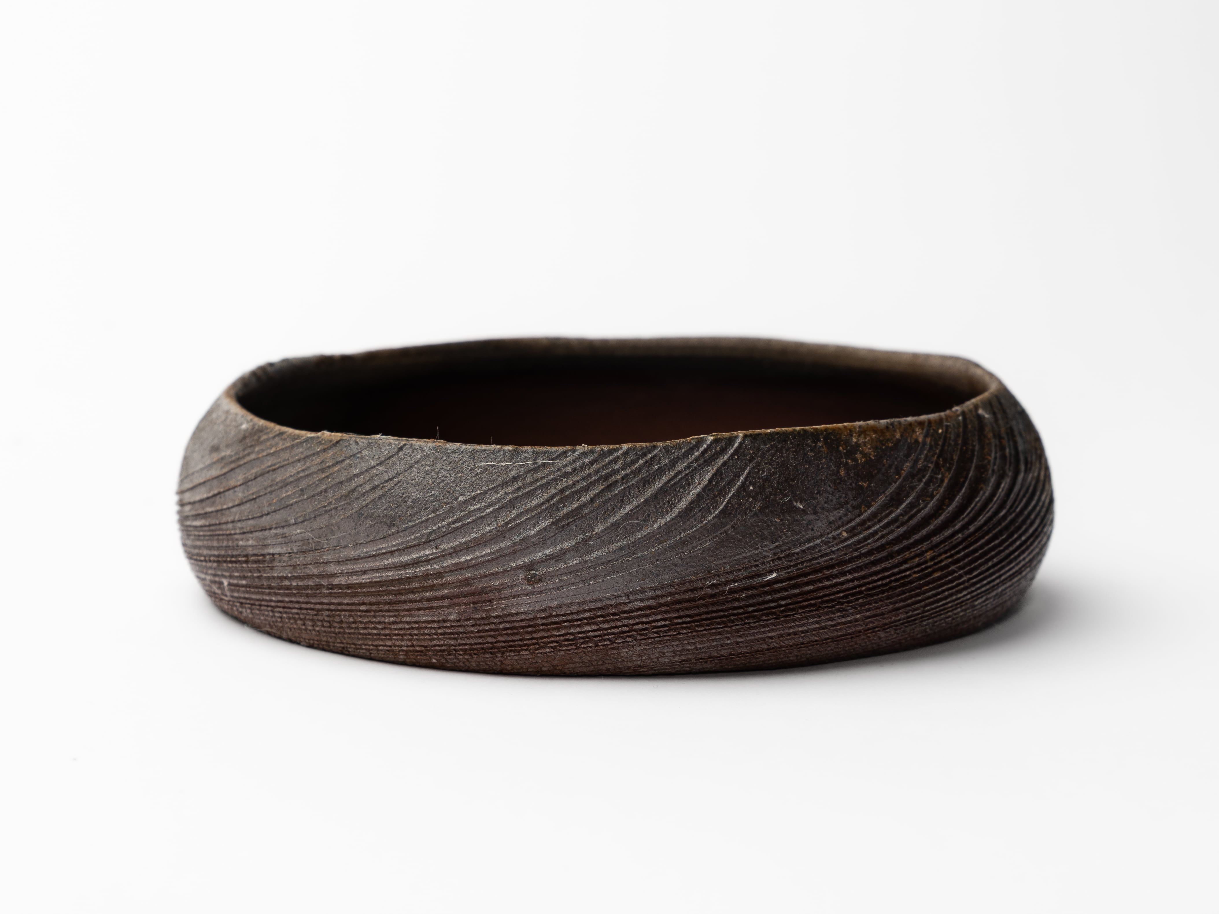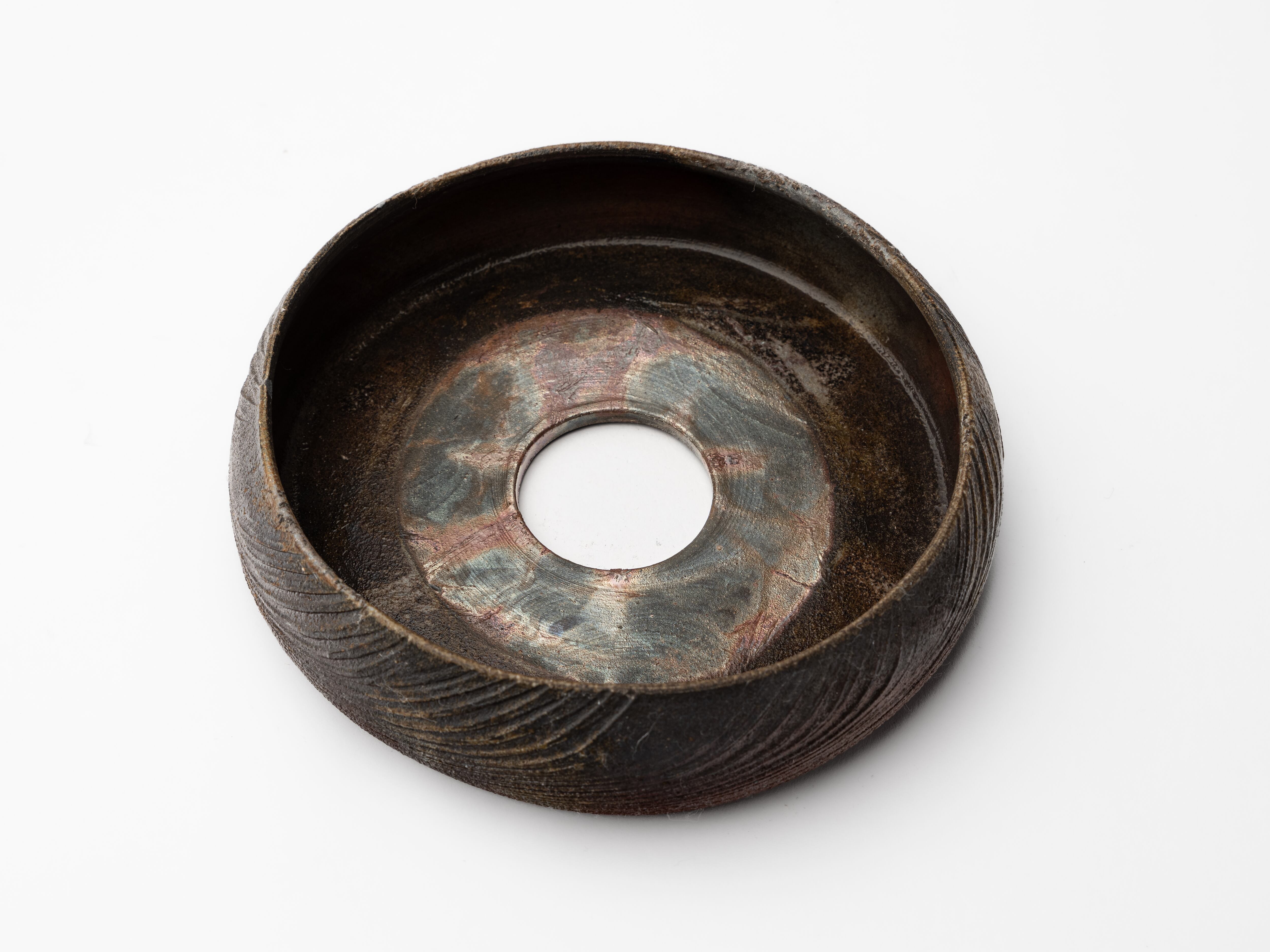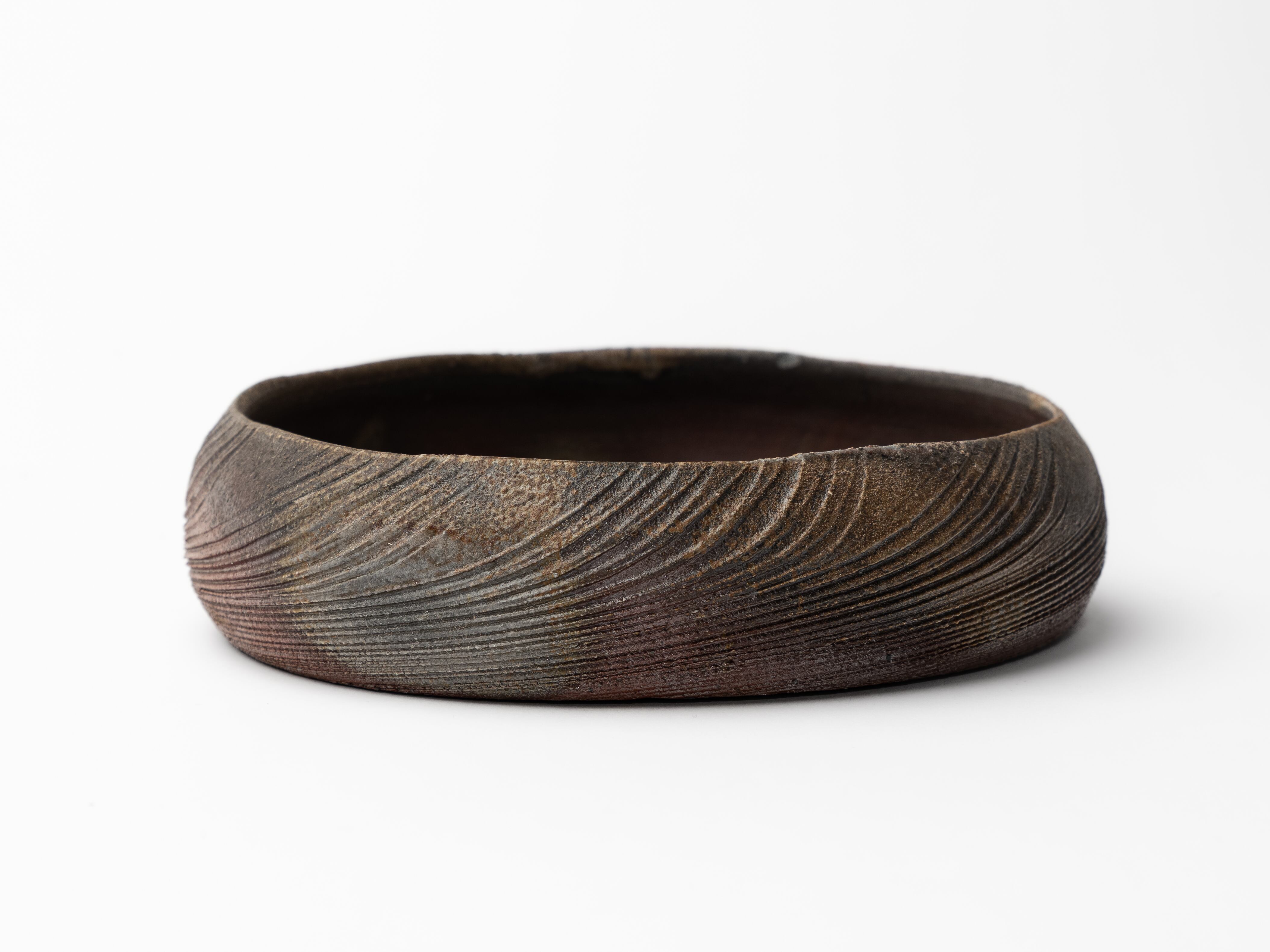 側面の面積はごく小さいものの、そこには驚くほど豊かな景色が広がっています。 指先でなぞりたくなるような繊細な螺旋模様。そして、薪窯の炎が運んだ灰や熱によって生まれた、赤褐色の土肌と鈍く光る金属的な色彩のグラデーション。