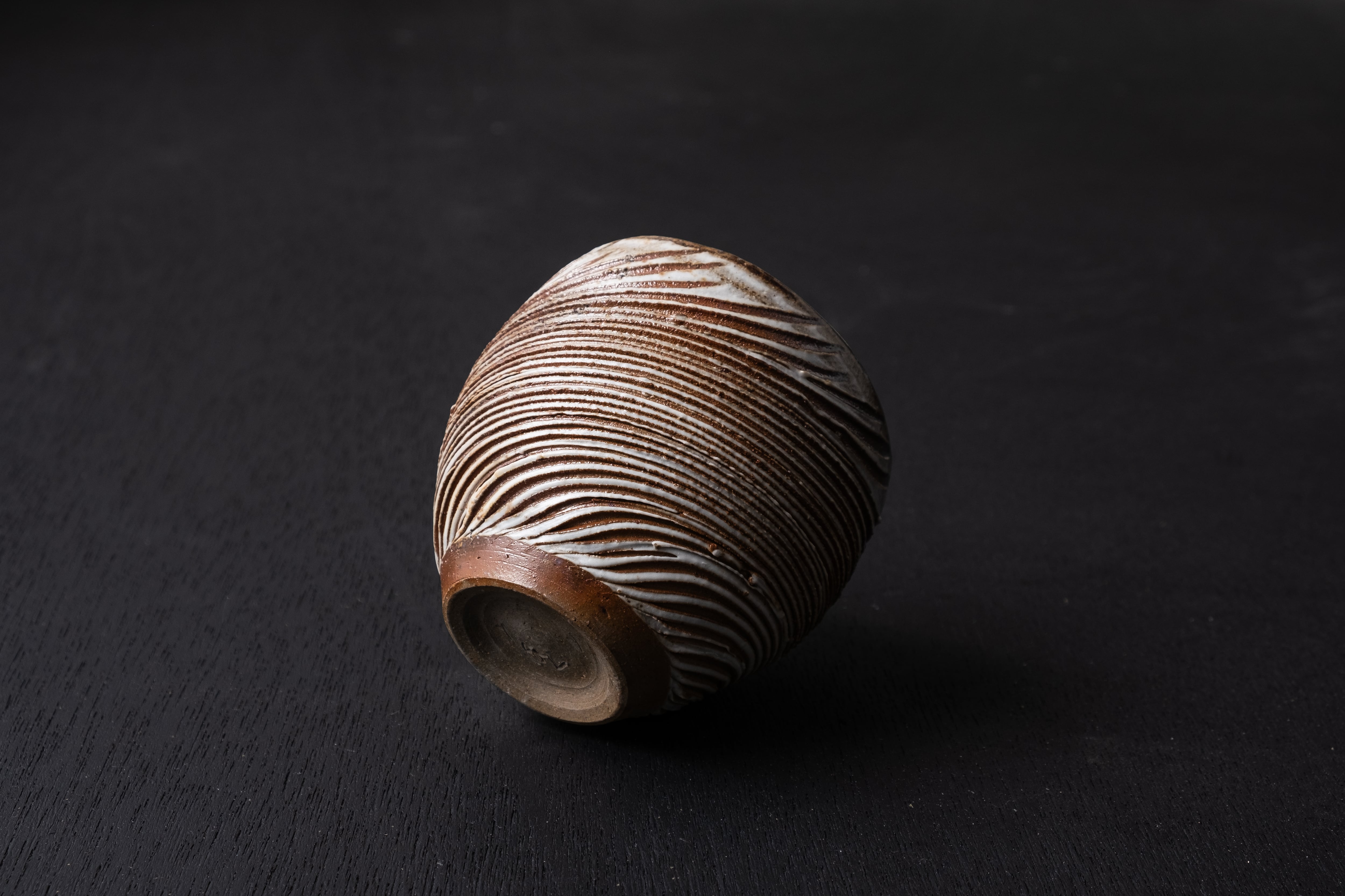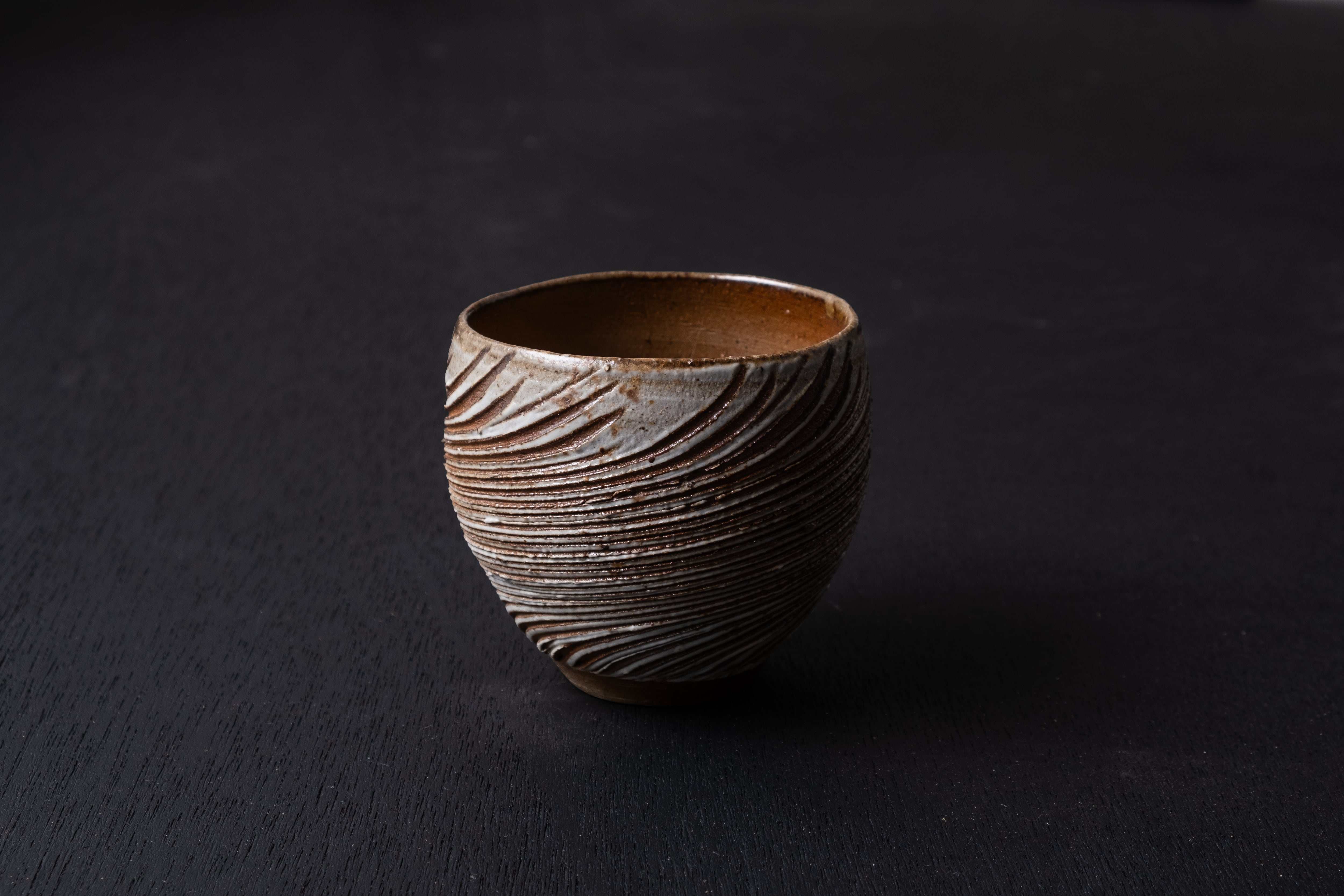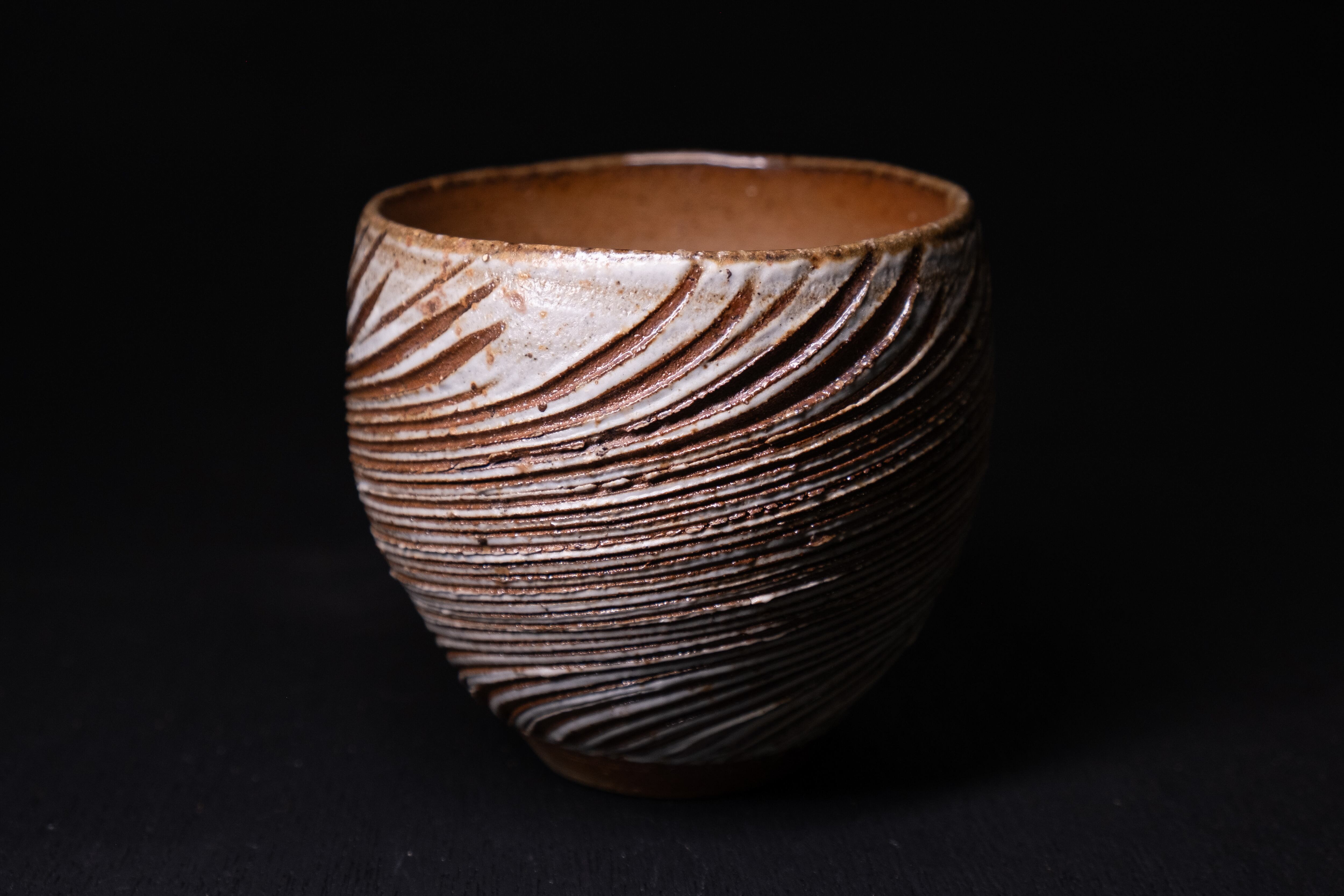 煙の少ない酸化焼成気味に焼かれたこちらの螺法杯は、磁器の化粧土の濃淡が美しく現れていて、